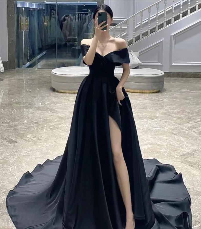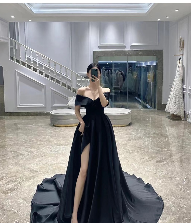 새틴 오프숄더 웨딩촬영 셀프웨딩 블랙드레스를 입고 특별한 날을 기억에 남도록 만들어 보세요