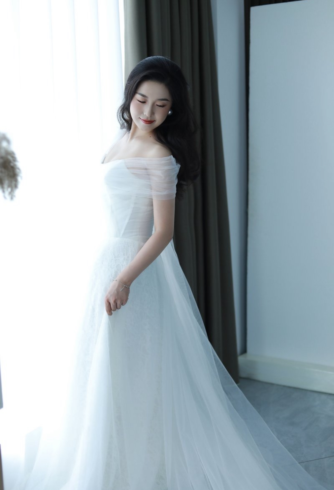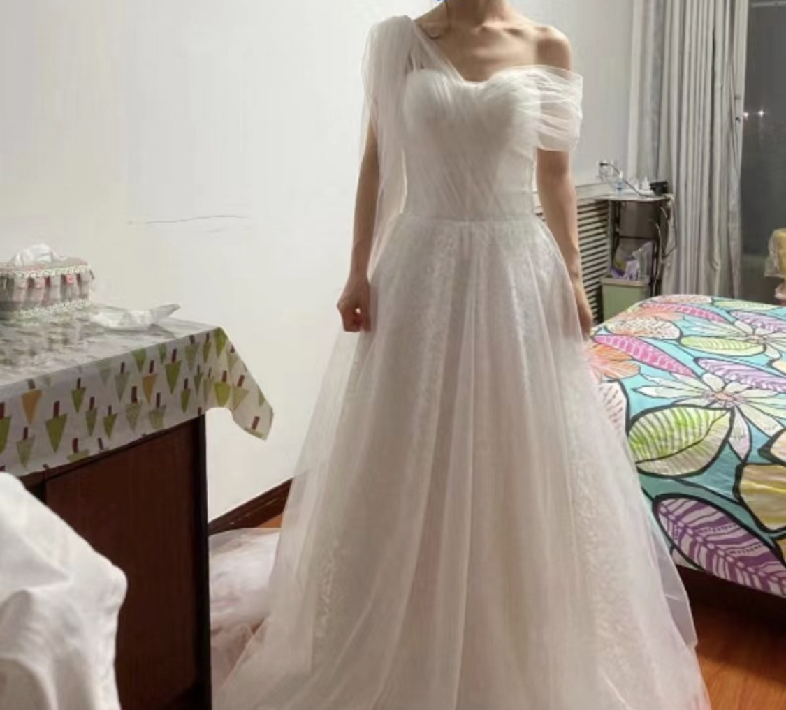 결혼식 당일, 이 드레스를 입고 나타났을 때의 기분은 정말 말로 표현할 수 없을 정도였어요. 모든 시선이 저에게 집중되었고, 수많은 사진 촬영에도 전혀 부담이 없었습니다. 레이스 오프숄더 디자인이 매력적이어서 더욱 기분이 좋았답니다.